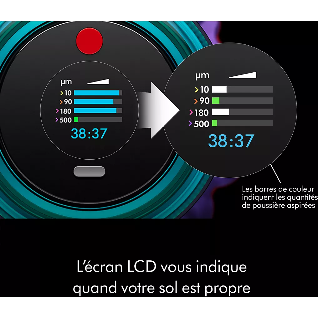 L’écran LCD intégré affiche l’autonomie restante, le mode de puissance et fournit une estimation de la propreté obtenue.