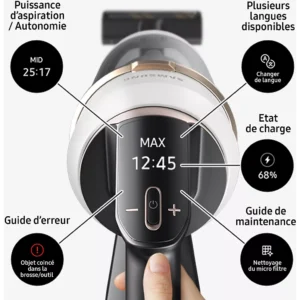 Cette autonomie étendue rend l’appareil particulièrement adapté aux maisons spacieuses et aux foyers nécessitant un nettoyage complet en une seule session.