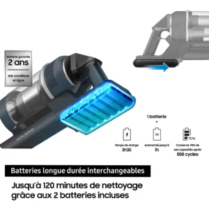 L’autonomie du Bespoke Jet Plus VS20B95B43N est un de ses points forts. Sa batterie longue durée permet de nettoyer de grandes surfaces sans interruption. Elle est également amovible, offrant la possibilité de la remplacer ou d’en ajouter une seconde pour prolonger l’usage lors de sessions prolongées.