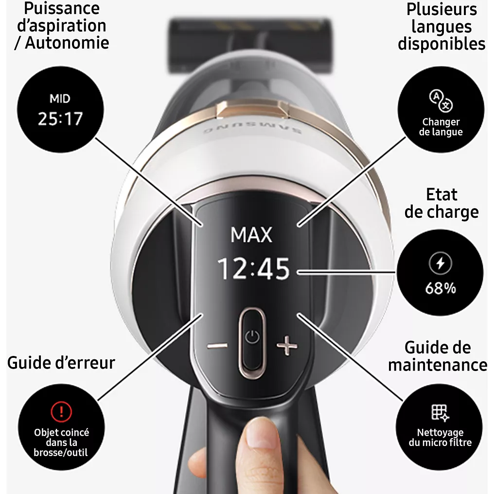 Grâce aux innovations Samsung, ce modèle offre une expérience de nettoyage fluide, rapide et agréable, tout en garantissant une performance stable sur tous les types de sols. Le Jet 85 Pet bénéficie d’une conception intelligente qui intègre une technologie d’aspiration avancée et des accessoires dédiés aux animaux, le tout dans un format léger et facile à manier.