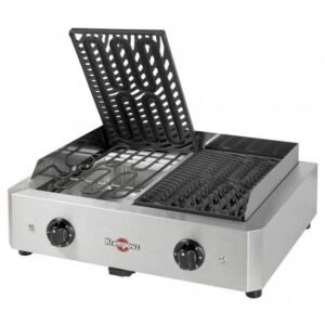 La plancha peut inclure un couvercle amovible ou ouvrant. Il permet de transformer l’appareil en four et de conserver la chaleur. Les pieds stables et antidérapants garantissent la sécurité sur toutes les surfaces. Compact et ergonomique, l’appareil se place facilement sur une table ou un chariot.