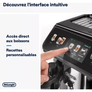L’interface de la machine est conçue pour offrir une expérience utilisateur fluide et agréable. Son écran tactile couleur permet de sélectionner facilement la boisson souhaitée, de personnaliser les réglages et d’accéder aux profils utilisateurs. Les icônes claires et la navigation intuitive rendent la machine accessible à tous, qu’il s’agisse d’un novice ou d’un utilisateur expérimenté.