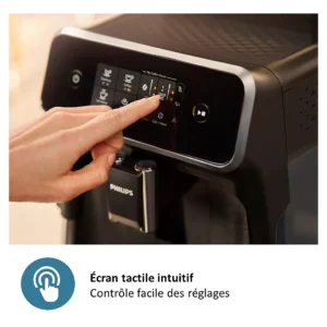 L’interface tactile de l’Expresso Broyeur PHILIPS EP1220/00 Noir Mat Série 1200 rend chaque étape de préparation accessible, même pour les utilisateurs novices. Les commandes sont clairement identifiées, ce qui permet de sélectionner facilement un espresso ou un café long. Cette simplicité d’utilisation est idéale pour un usage quotidien, que ce soit au petit-déjeuner, au bureau ou en fin de journée.
