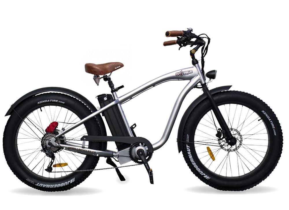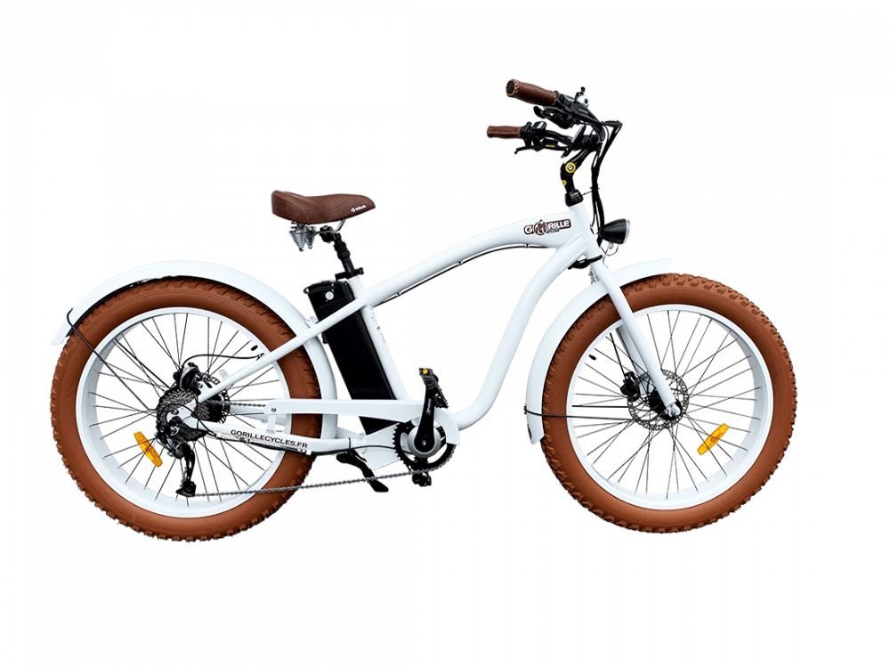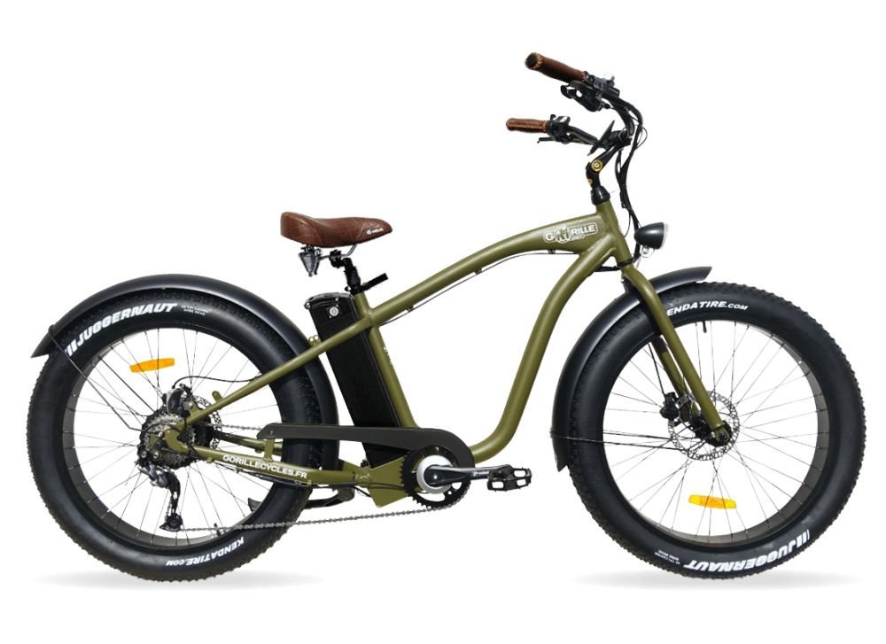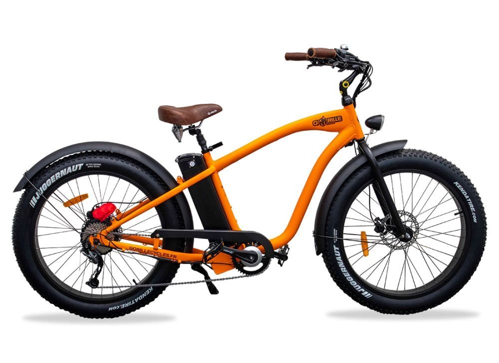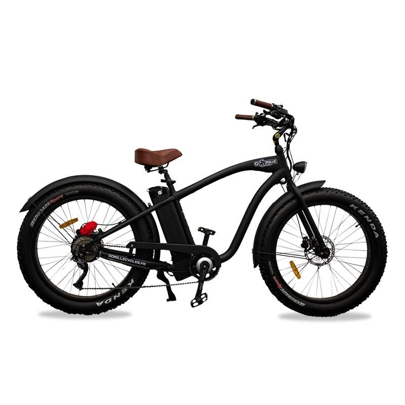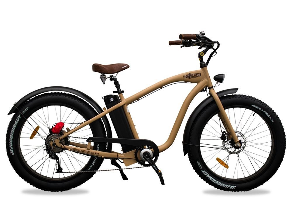 Fatbike électrique Gorille Mâle, design de beach cruiser californien, confort de premier choix et style unique. Domptez-le et redécouvrez tous vos trajets le sourire aux lèvres !