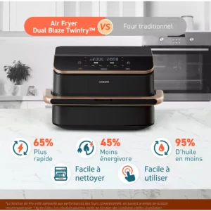 La friteuse sans huile COSORI Twinfry Chef Edition se distingue par sa technologie Dual Blaze à 4 résistances, garantissant une cuisson rapide et homogène sans préchauffage. Grâce à ses deux chauffages en haut et en bas, elle offre une polyvalence totale avec 6 modes de cuisson, permettant de préparer de l’entrée au dessert dans un seul appareil.