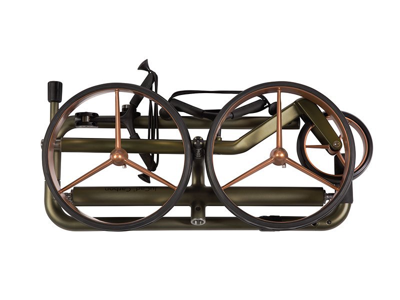 La nature est la source d’inspiration pour les tons verts irisés de ce chariot électrique sensationnel. Les reflets de la lumière font scintiller et briller élégamment le cadre en carbone et les jantes de couleur or rose. Le chariot léger et résistant, démontable de façon très compacte, se range non seulement dans tous les types de coffre de voiture de sport, mais aussi avec le sac de golf dans une housse de voyage. « Inspired by Nature ».