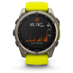 L’un des plus grands atouts de la Garmin Fenix 8 Solar Sapphire Titane 51 mm réside dans sa capacité d’autonomie exceptionnelle. Grâce à la technologie solaire Power Glass, la montre convertit l’énergie lumineuse en électricité pour prolonger ses performances.