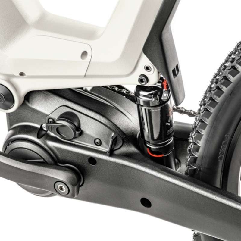 Le cadre présente deux parties, chacune étant conçue d’une seule pièce aluminium renforcée et ultra-robuste, moulée et forgée par gravité, sans soudures. La partie avant est en forme de J et intègre la batterie (avec une ouverture par le haut). Pour la seconde partie, c’est un bras oscillant monopoutre qui fait l’économie des haubans, à l’intérieur duquel se fond le moteur Bosch, qui devient quasi-invisible. Positionné verticalement, l’amortisseur fait le lien entre les deux parties via un axe puissant et des roulements surdimensionnés.