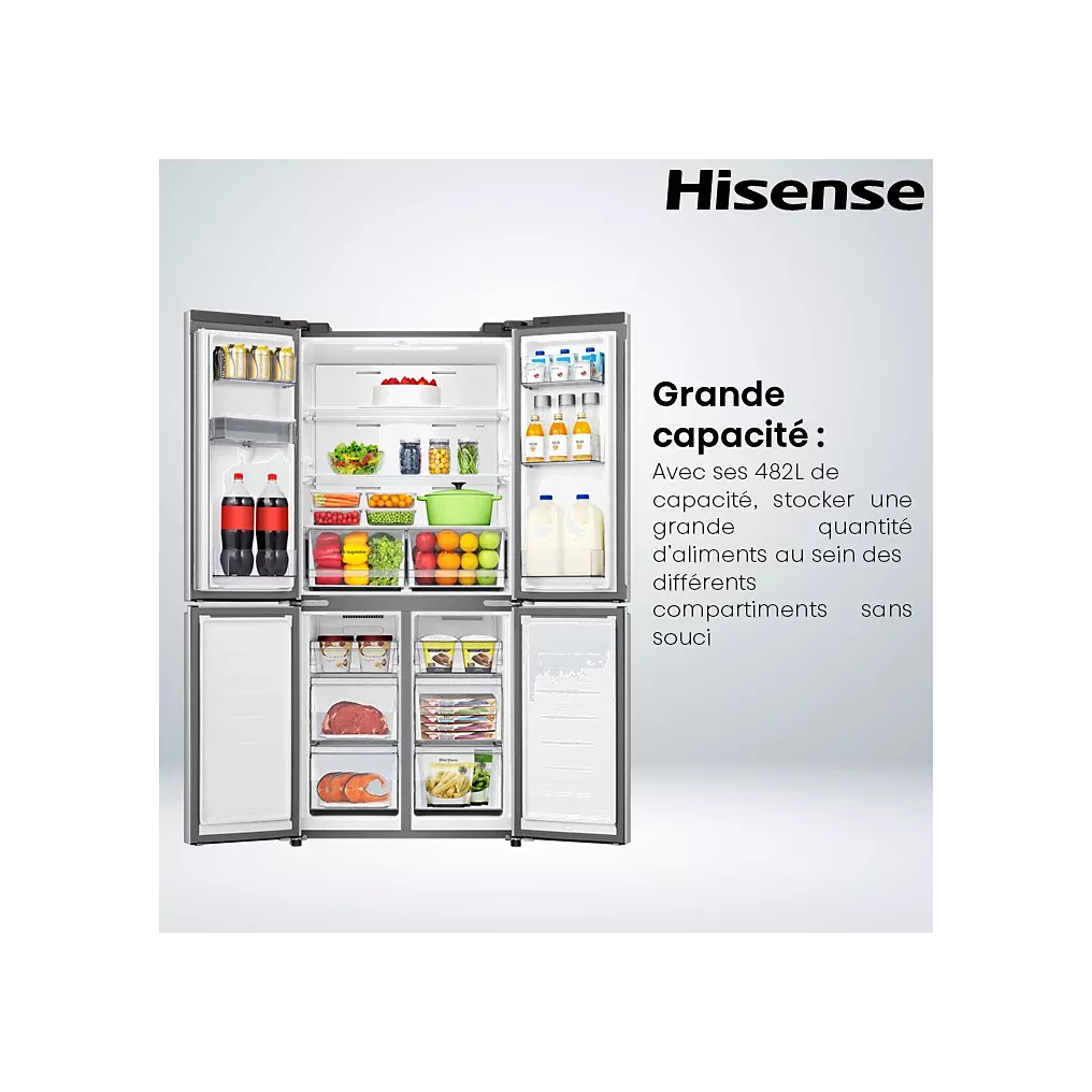 Le réfrigérateur multi‑portes HISENSE RQ5P470SMIE est un appareil haut de gamme conçu pour les foyers exigeants, offrant à la fois grande capacité de stockage, technologie avancée de conservation des aliments, et confort d’utilisation quotidien. Avec son design moderne en inox anti‑traces et ses portes multi‑portes, ce modèle allie esthétique, praticité et performance.