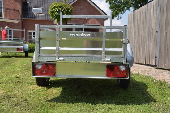 Cette remorque 200×100 cm (dimensions extérieures) en aluminium et simple essieu n’a, grâce à sa largeur de moins de 115cm, pas besoin de feux d’encombrement (de côté), mais est quand même pourvue d’une bande de feux (feux de position arrière, feux-stop, feux clignotants,…). La remorque est équipée d’une prise à 7 broches.