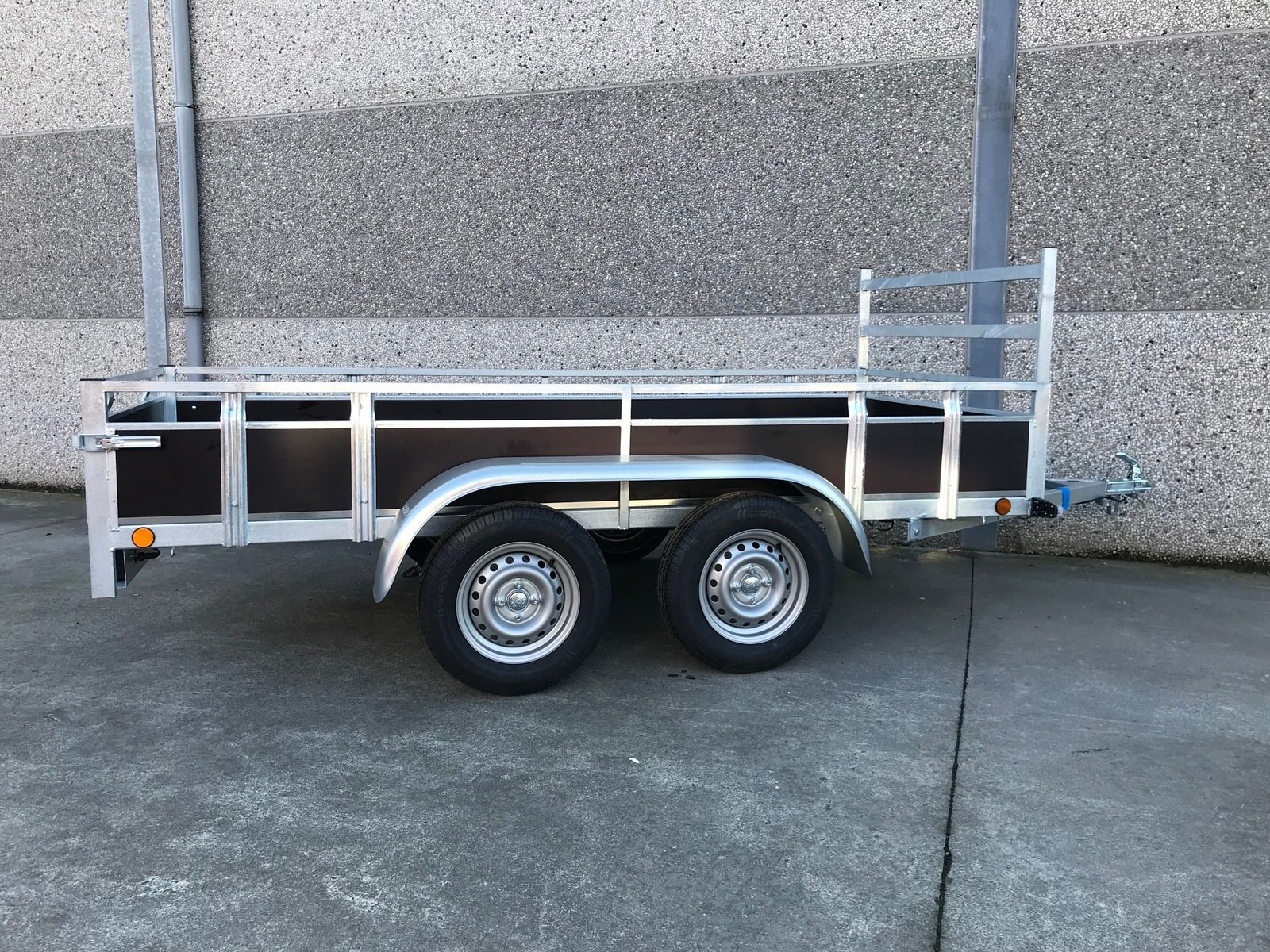 Cette Remorque 300×132 cm double essieux (dimensions extérieures) double essieux est pourvue de feux d’encombrement (de côté) et d’une série de feux à l’arrière (feux de position arrière, feux-stop, feux clignotants, …). Les feux d’encombrement (de côté) sont obligatoires à partir d’une largeur de plus de 115 cm. La remorque est équipée d’une prise à 7 broches.