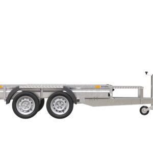 La remorque de transport UNITRAILER STARK 3 260 est également une structure durable, conçue spécifiquement pour le transport de mini-pelles et de matériaux de construction lourds. Deux essieux et une roue de support facilitent la manœuvre, et le support de godet facilite le transport des machines.