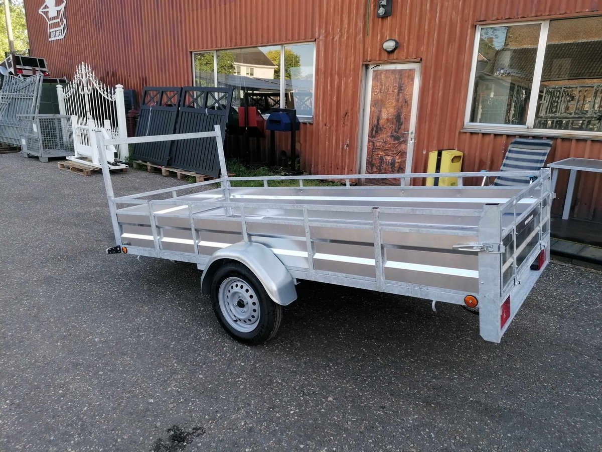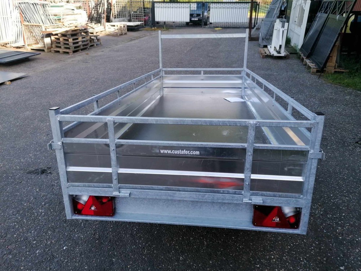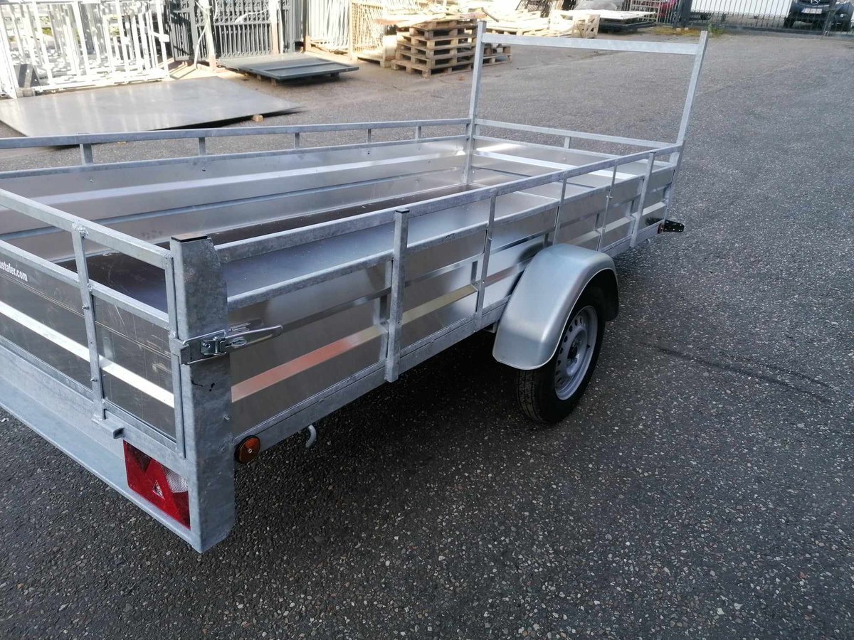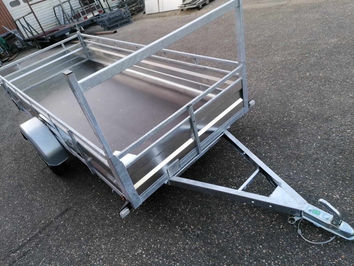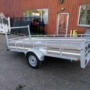 Cette Remorque simple essieu aluminium 300×132 cm (dimensions extérieures) en aluminium et simple essieu est pourvue de feux d’encombrement (de côté) et d’une bande de feux à l’arrière (feux de position arrière, feux-stop, feux clignotants, …). Les feux d’encombrement (de côté) sont obligatoires à partir d’une largeur de plus de 115cm. La remorque est équipée d’une prise à 7 broches.