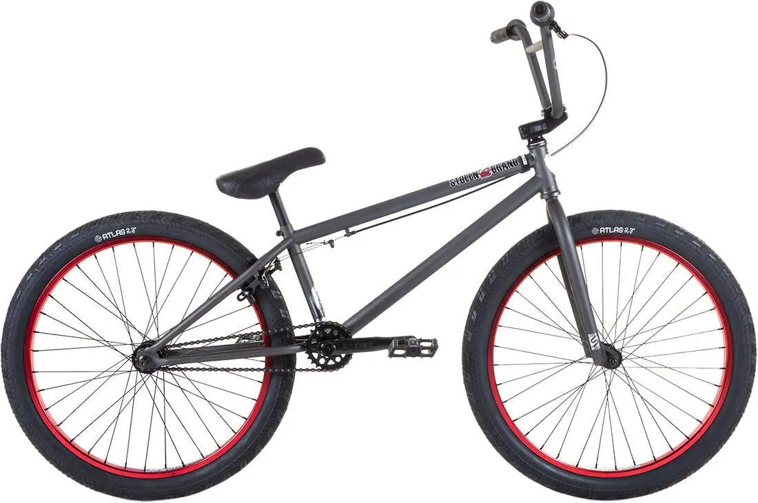 Les roues de 24 pouces sont montées sur des jantes doubles parois Stolen Rampage avec 36 trous, assurant une grande solidité. Les pneus larges offrent une adhérence optimale sur asphalte, béton et surfaces légèrement irrégulières. Leur gomme est conçue pour résister à l’usure liée aux figures freestyle.