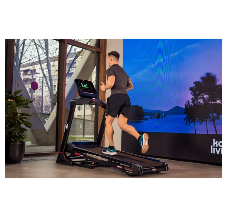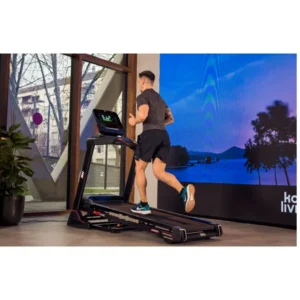 Tapis de Course BH RS800 TFT verticalement avec console tactile 10 pouces, connexion MP3 et haut-parleurs intégrés, système d’amortissement Air Cushion composé de 6 élastomères, compatibilité Zwift, kinomap, jusqu’à 20 km/h et 12% d’inclinaison, 32 programmes, jusqu’à 5 profils utilisateurs.