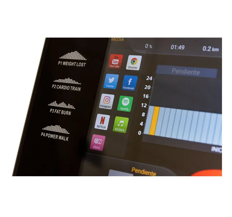 Avec des informations sur le temps, l’inclinaison, le pouls, la vitesse, la distance, les calories. Possibilité d’utiliser des applications directement sur le moniteur. Vous pouvez naviguer et utiliser le moniteur comme une tablette. Il s’agit d’un écran tactile.