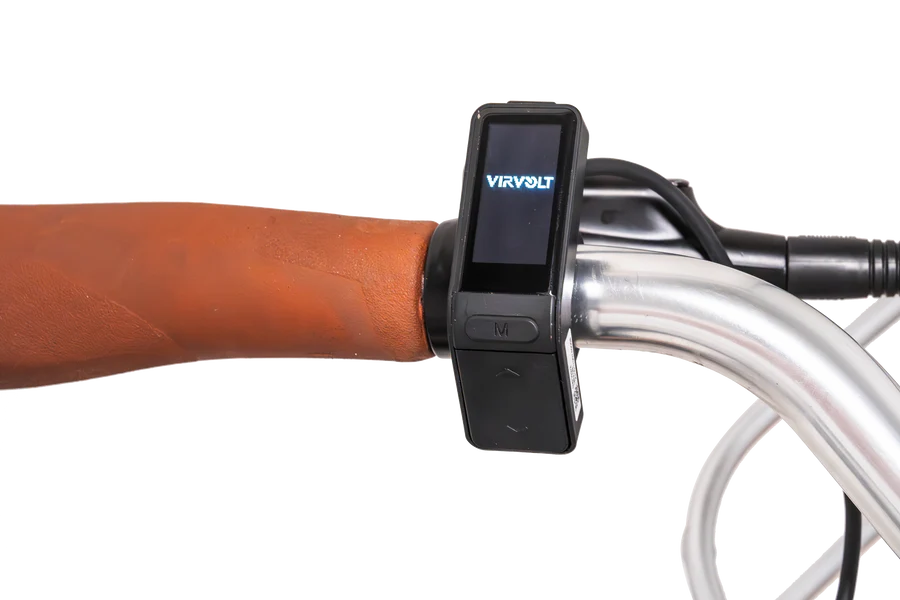 Moteur pédalier débrayable du kit Add-e, pèse seulement 2 kg. L’assistance est délivrée via un rouleau dont la bande de roulement vient en contact avec le pneu arrière. Un écran de contrôle proposant 5 niveaux d’assistance.