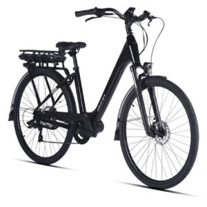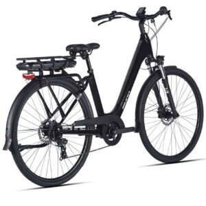 Le vélo est également équipé d’accessoires pratiques, tels que des garde-boue, un porte-bagages et un système d’éclairage intégré. Ces éléments renforcent sa praticité au quotidien et permettent de transporter des charges légères ou des courses en toute sécurité.