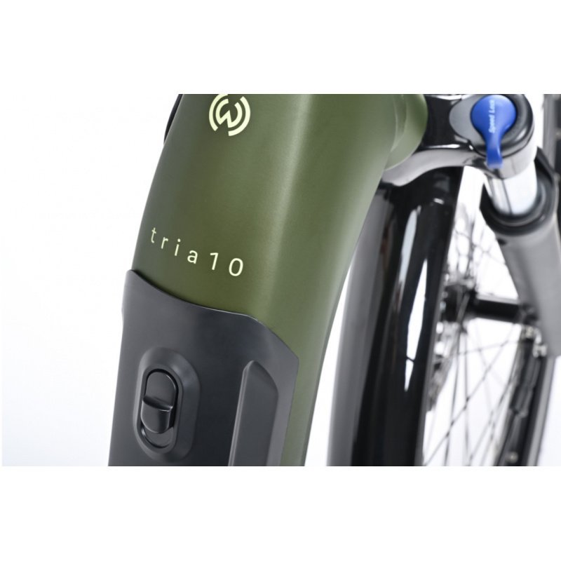 Le Winora Tria 10 dispose d’une batterie intégrée dans le tube diagonal du cadre. Cette intégration permet non seulement un design épuré et moderne mais également une meilleure répartition du poids, ce qui améliore la stabilité et le confort de conduite. La batterie est facilement rechargeable et offre une autonomie adaptée aux déplacements urbains quotidiens et aux sorties plus longues en périphérie.