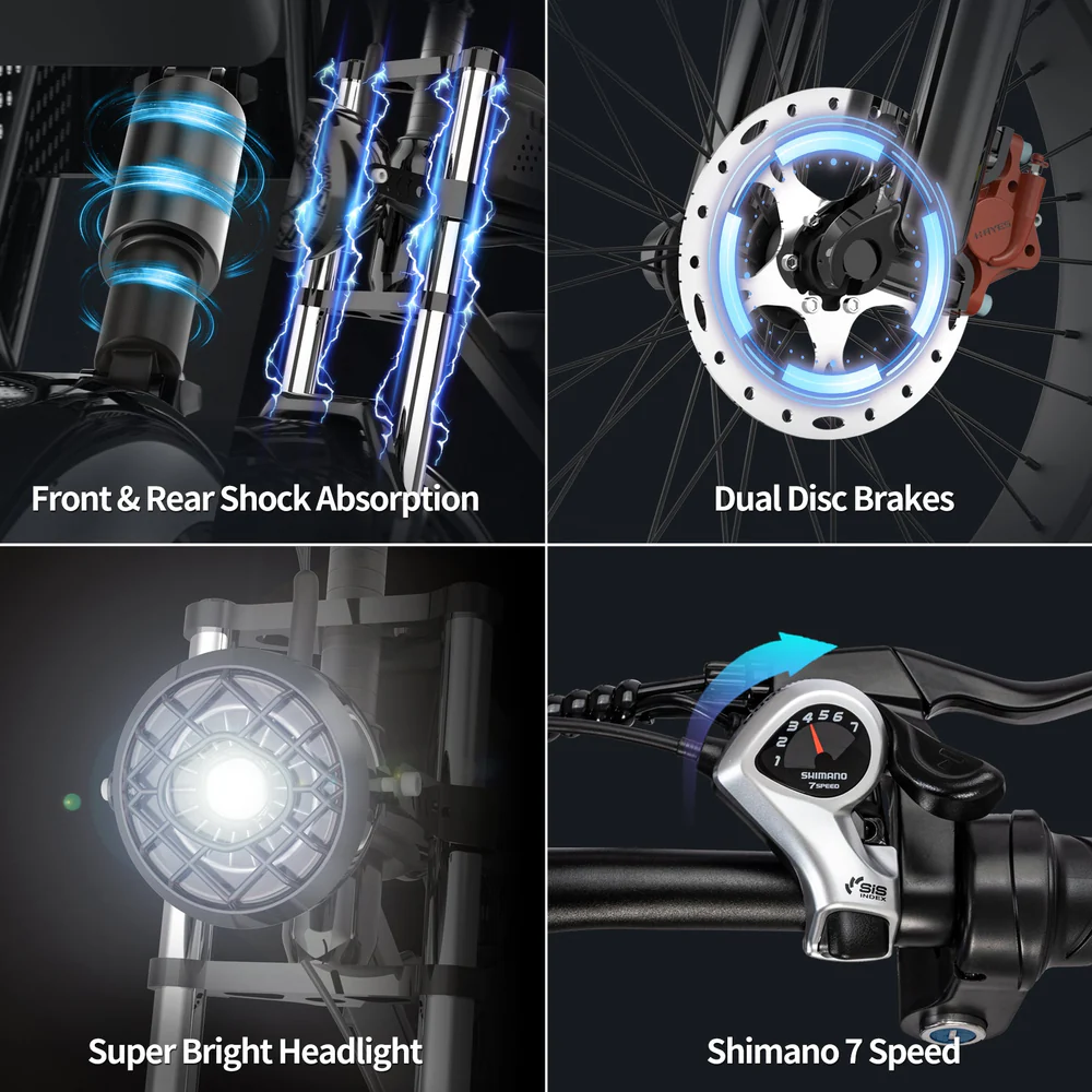 Conquérez n’importe quelle surface en toute confiance grâce à notre VTT électrique équipé de pneus larges anti-crevaison de 20″*4.0″, conçus pour gérer l’herbe, la terre, le sable, la neige et le gravier sans effort