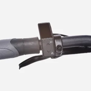 Écran de contrôle LCD central indiquant vitesse, distance, niveau de batterie et mode d’assistance.
