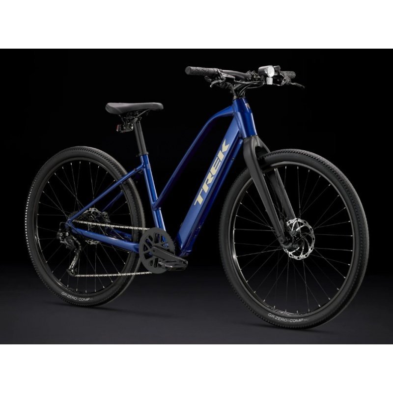 Un cadre et une fourche légers en aluminium, le système d’assistance au pédalage exclusif de Trek doté d’un moteur-moyeu (250 W, 40 Nm) offrant une assistance allant jusqu’à 25 km/h et une batterie de 250 Wh pour une autonomie sur une distance allant jusqu’à 55 kilomètres par charge. Ses roues rigides 650b et ses pneus larges 50c offrent plus de performance et de confort sur les terrains variés. Il est aussi doté d’une transmission fiable Shimano à 9 vitesses, de freins à disque hydrauliques, d’éclairages intégrés alimentés par la batterie, et d’une béquille.